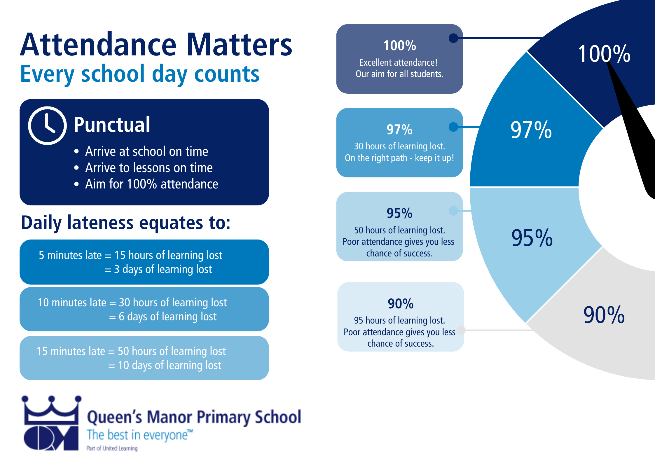 Appointments with doctors, dentists or at a hospital should be made outside of school hours or in the holidays. Where this is not possible, the details of the appointment including any letters must be brought into the School Office or emailed to admin@queensmanorprimary.org.uk the day before, or earlier if possible, so that the register can be marked accordingly.